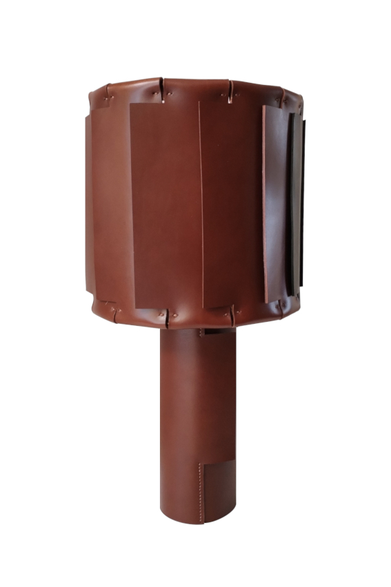 Abat-jour en bandes de cuir au tannage végétal coupées et cousues comme des écailles, laissant entrevoir la lumière par de très fines fentes verticales.