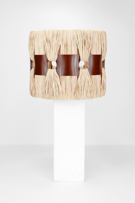 Abat-jour en raphia naturel et cuir au tannage végétal marron, tissé à la main dans notre atelier.