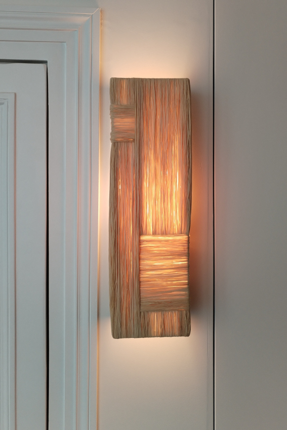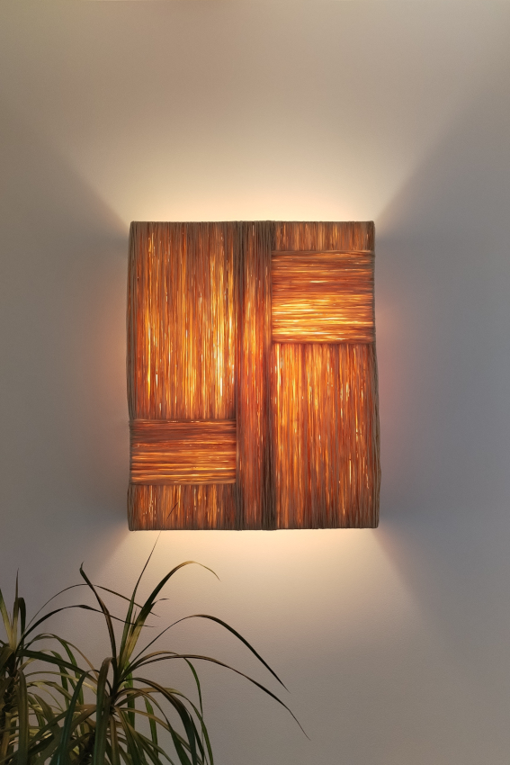 Abat-jour en raphia naturel tissé à la main dans notre atelier verticalement et horizontalement.