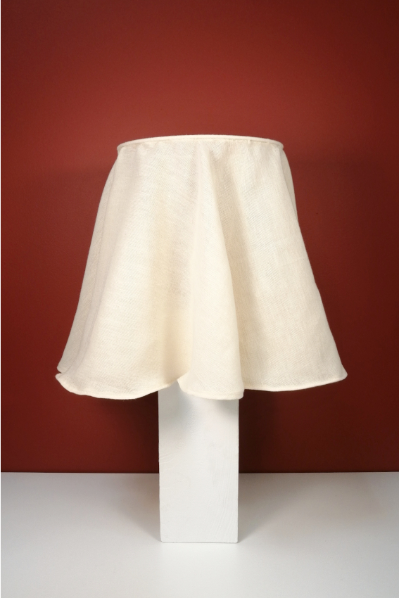 Présenté ici dans une fine toile de coton blanc cassé, cet abat-jour est réalisable à vos mesures et dans le tissu de votre choix.
