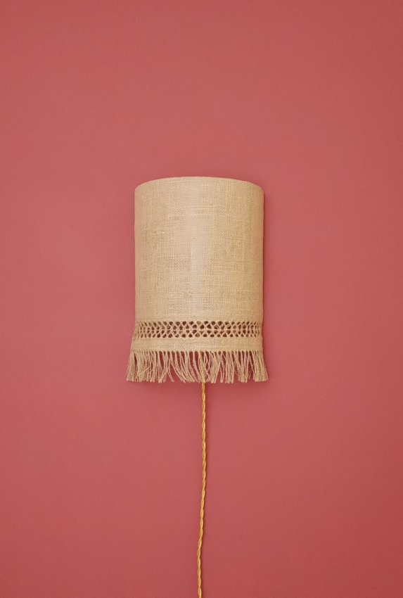 Abat-jour pour applique en toile de jute brodée et frangée. Plusieurs motifs possibles.