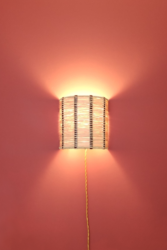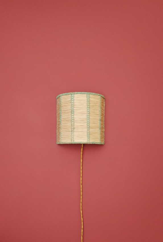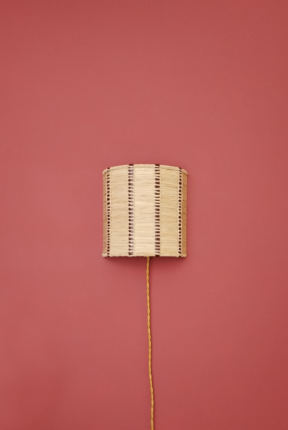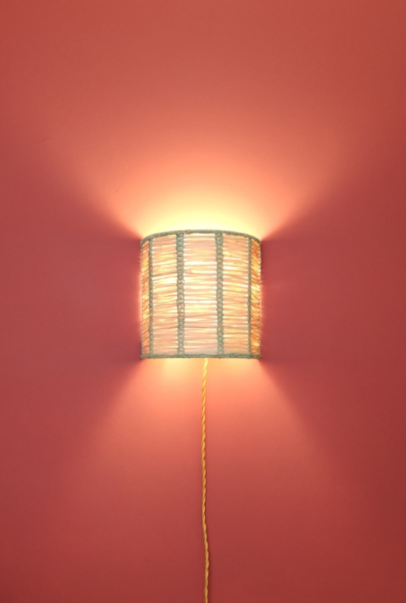 Abat-jour pour applique en raphia tissé à la main avec des inserts de cuir. Il est également possible de tisser le raphia naturel avec du raphia de couleur comme sur les photos suivantes.