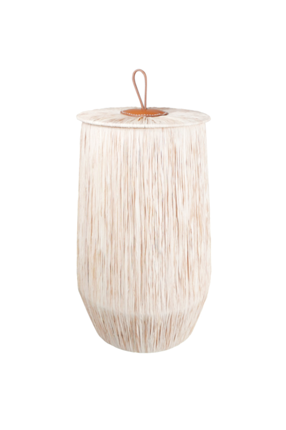 Grande corbeille en raphia naturel tissé sur une structure en métal avec un couvercle retenu par une poignée en cuir cousue à la main au point sellier.